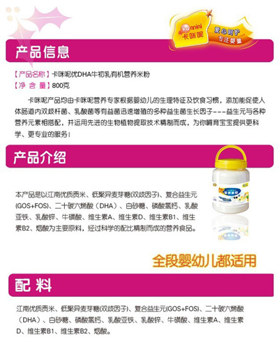 卡咪呢有機米粉系列是專為中國寶寶設(shè)計的營養(yǎng)輔食,選用有機大米,科學(xué)搭配維生素AD等維生素,還特別添加;撬帷HA、AA等有助智力發(fā)育的營養(yǎng)成分,富含15種營養(yǎng)素,F(xiàn)上?ㄟ淠啬笅胗闷酚邢薰久嫦蛉珖瞻资袌鰠^(qū)域誠招卡咪呢有機米粉代理商。
